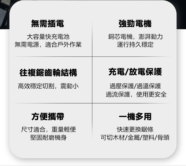 4分鐘前【德國精工鋰電鋸】鋼、鐵、磚頭、木材,統統都能鋸!續航久、充電快,方便攜帶,一機多用 - 26V德國精工往複鋸(機頭+1充1電)贈工具箱+5鋸條NT$1790