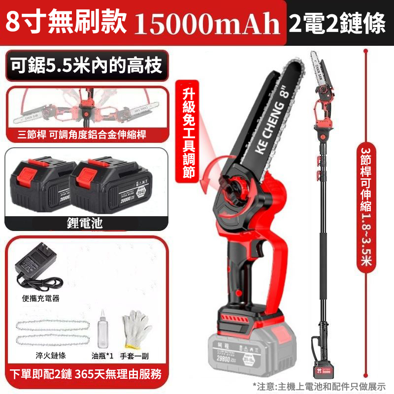 2分鐘前果農修枝好幫手】德國KECHENG進口電動伸縮鋰電鋸-5.5米高枝輕鬆鋸!動力強勁,果園工作不費力! - 可鋸5.5米伸縮桿+8吋鋰電鋸【單電】NT$3790